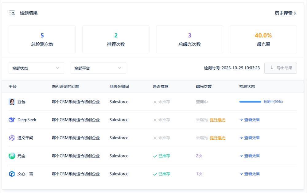 数据很直观:总检测次数、推荐数、曝光率这些指标都有,不用自己分析半天。更重要的是,能看竞品在同一问题下的表现,这对调整策略特别有用。