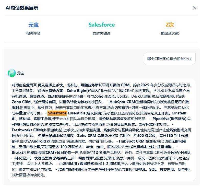 自定义提问,模拟真实用户搜索。比如你可以问"哪个CRM系统适合初创企业",看AI怎么回答